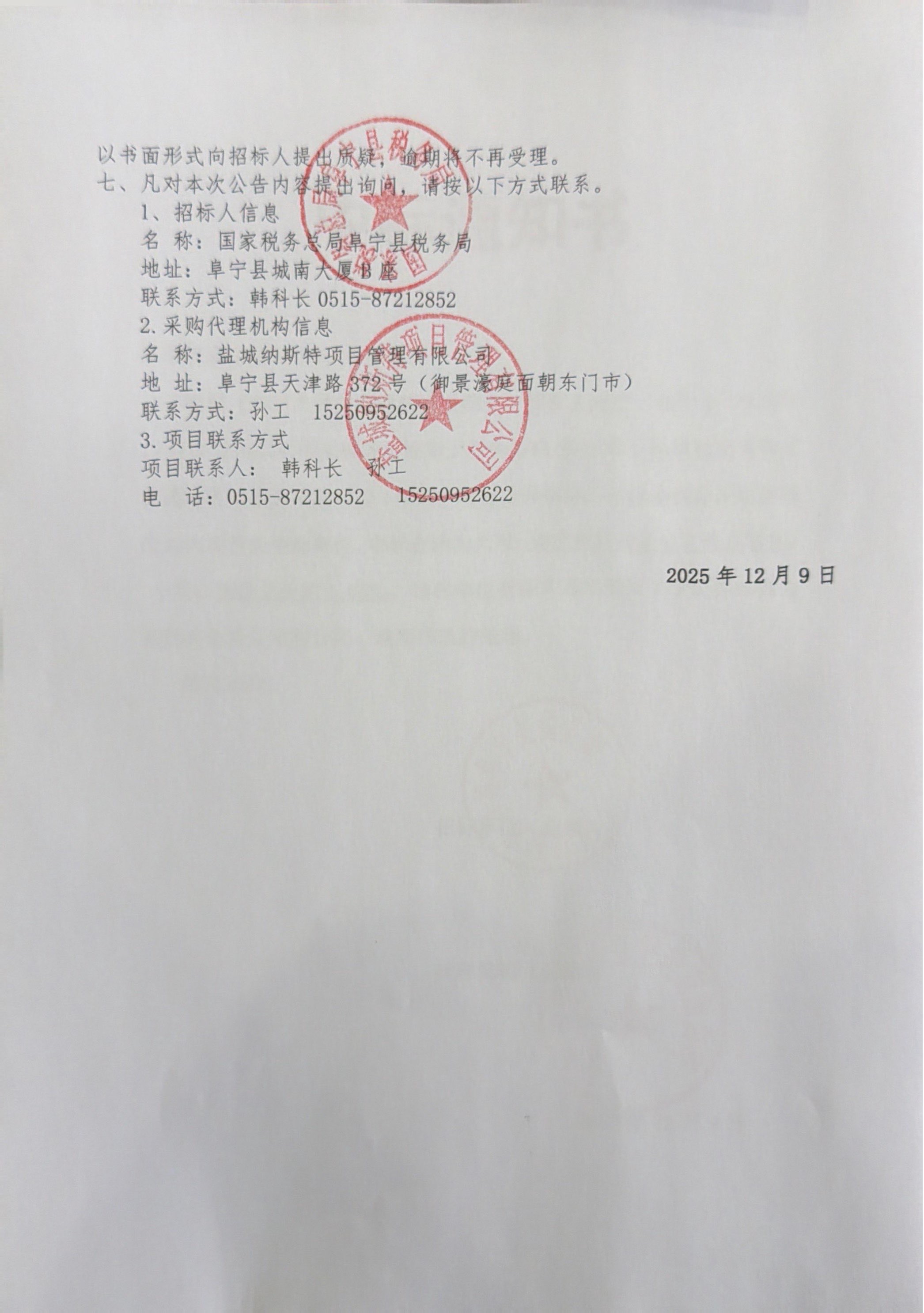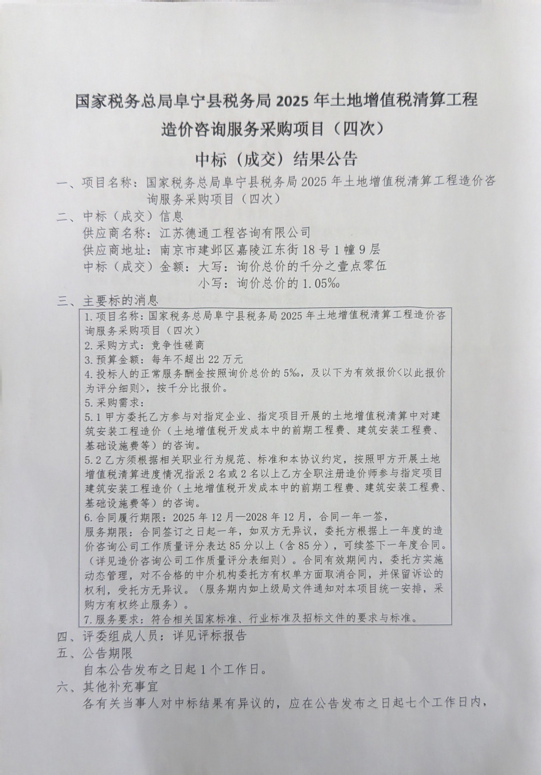国家税务总局阜宁县税务局2025年土地增值税清算工程造价咨询服务采购项目(四次)中标(成交)结果公告