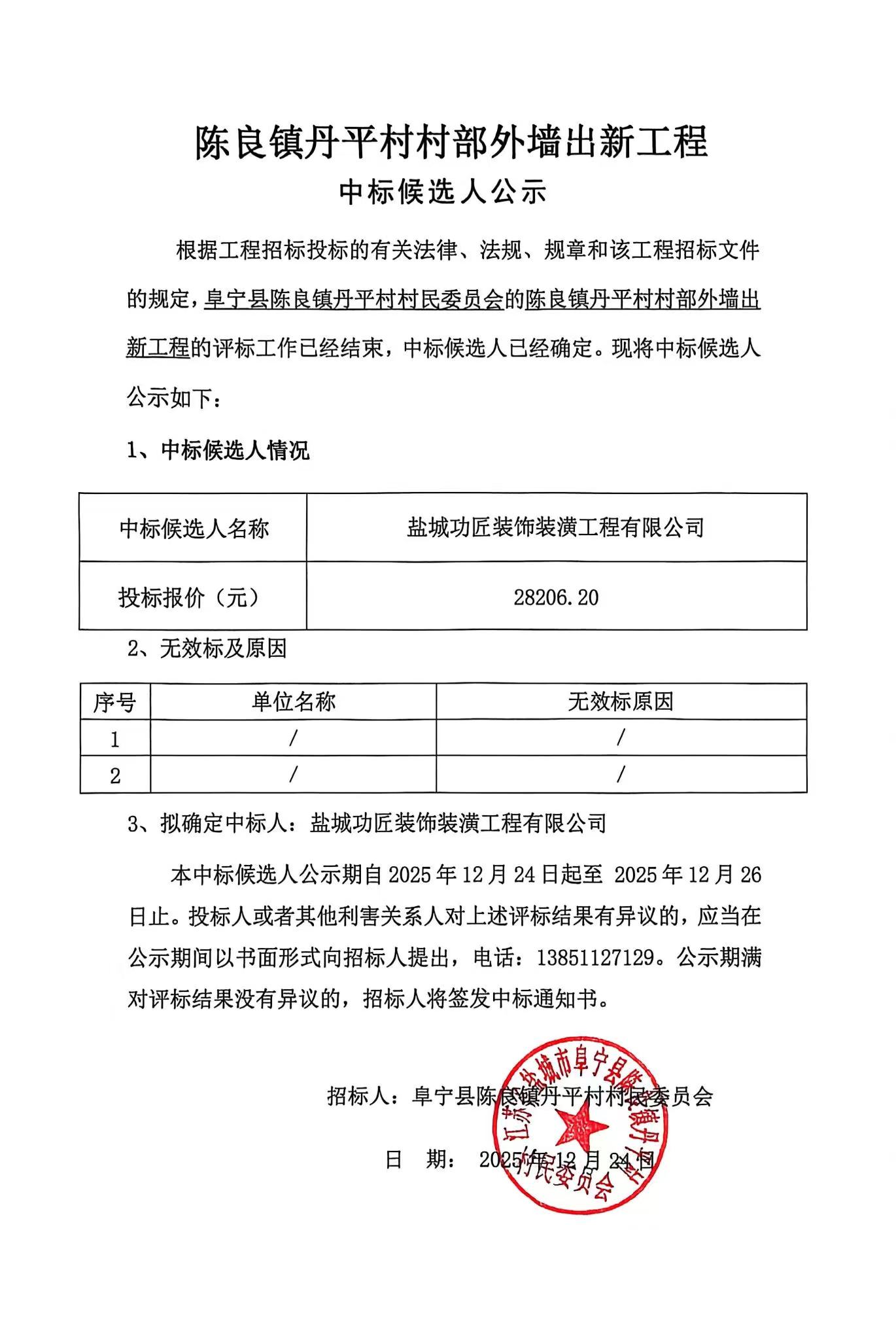 陈良镇丹平村村部外墙出新工程 中标候选人公示