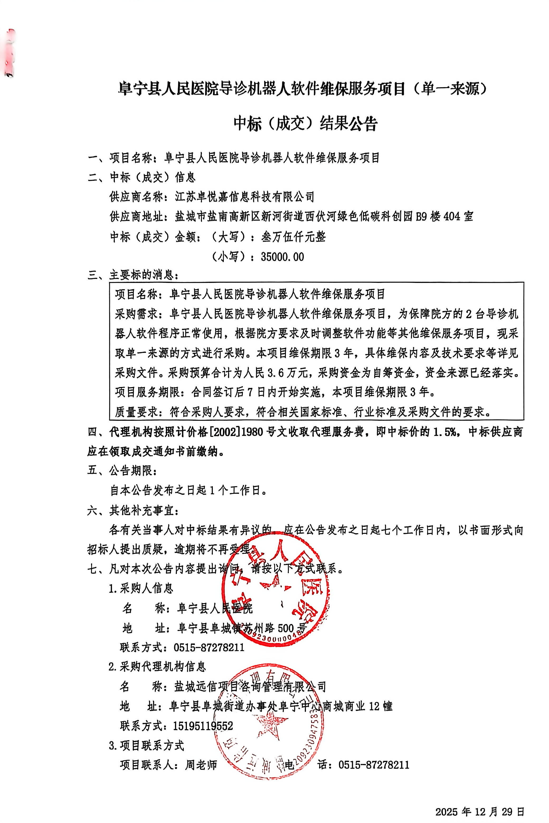 阜宁县人民医院导诊机器人软件维保服务项目(单一来源)中标结果公告