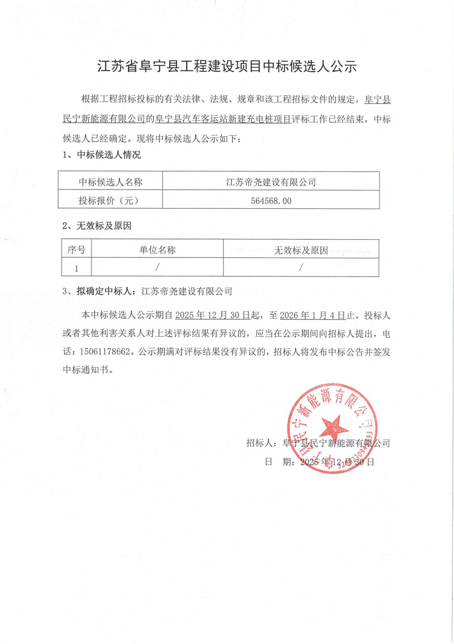 阜宁县汽车客运站新建充电桩项目中标候选人公示