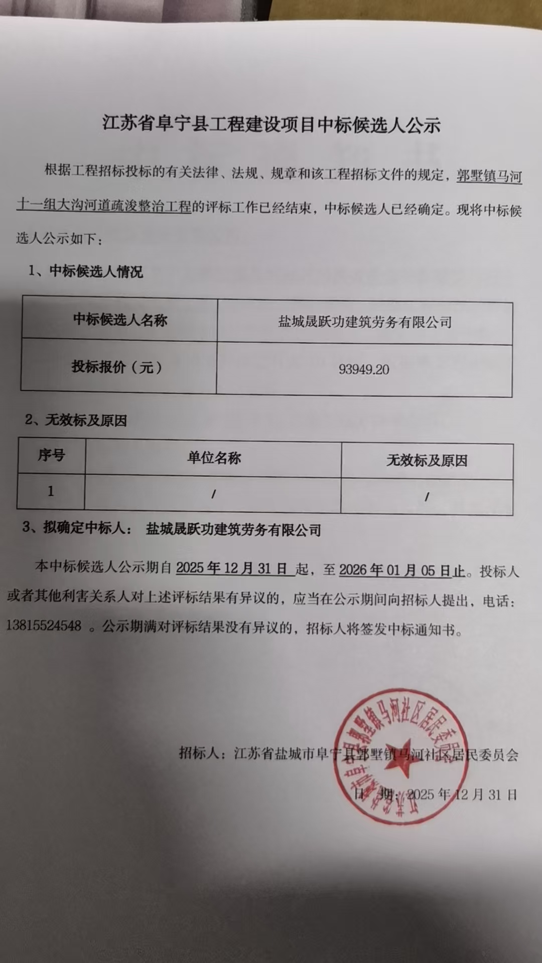 郭墅镇马河十一组大沟河道疏浚整治工程中标候选人公示