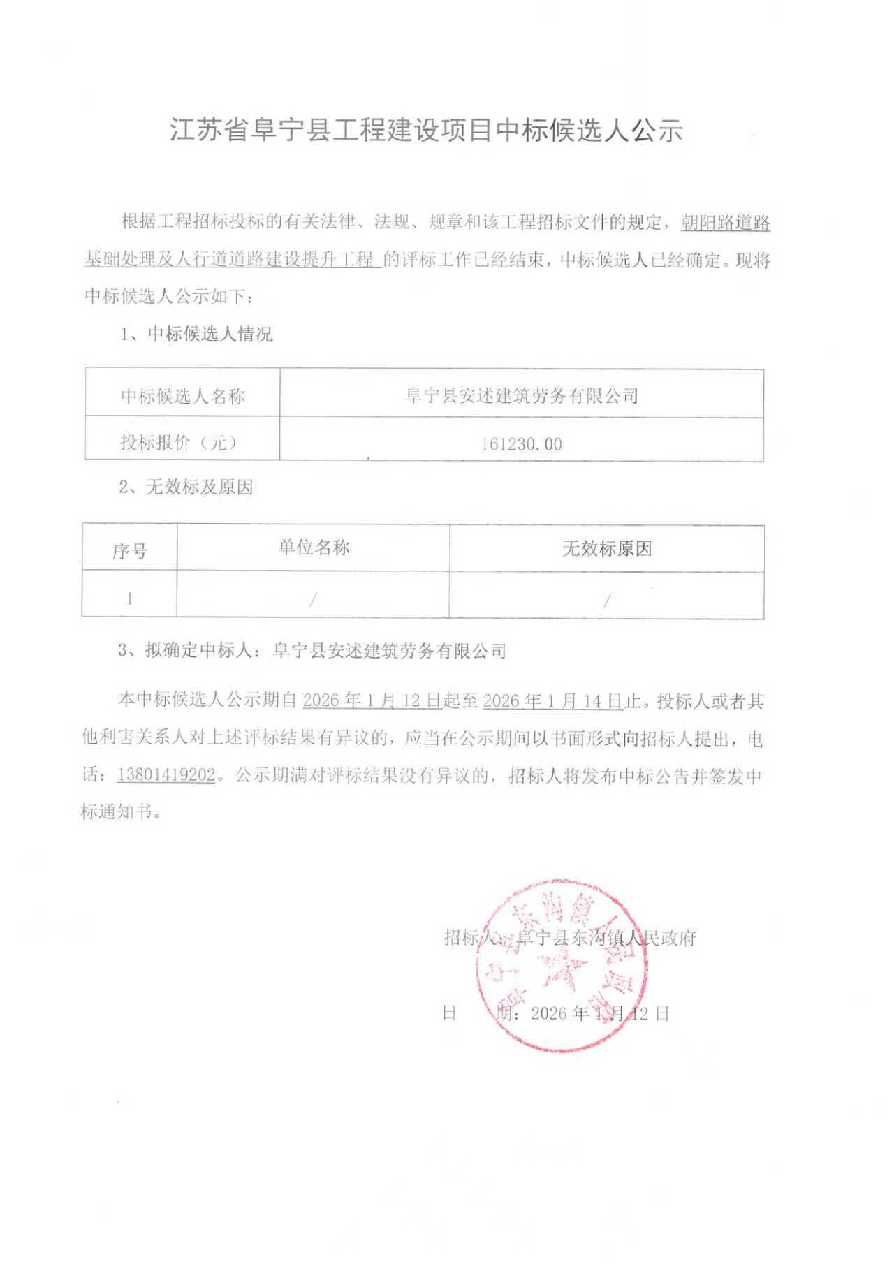 朝阳路道路基础处理及人行道道路建设提升工程中标候选人公示