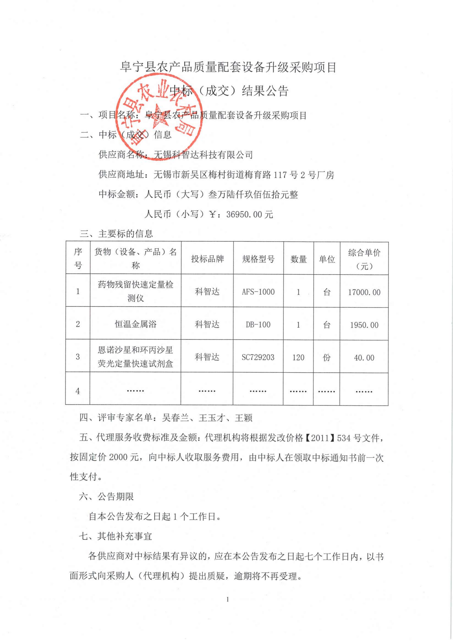 阜宁县农产品质量配套设备升级采购项目成交结果公告