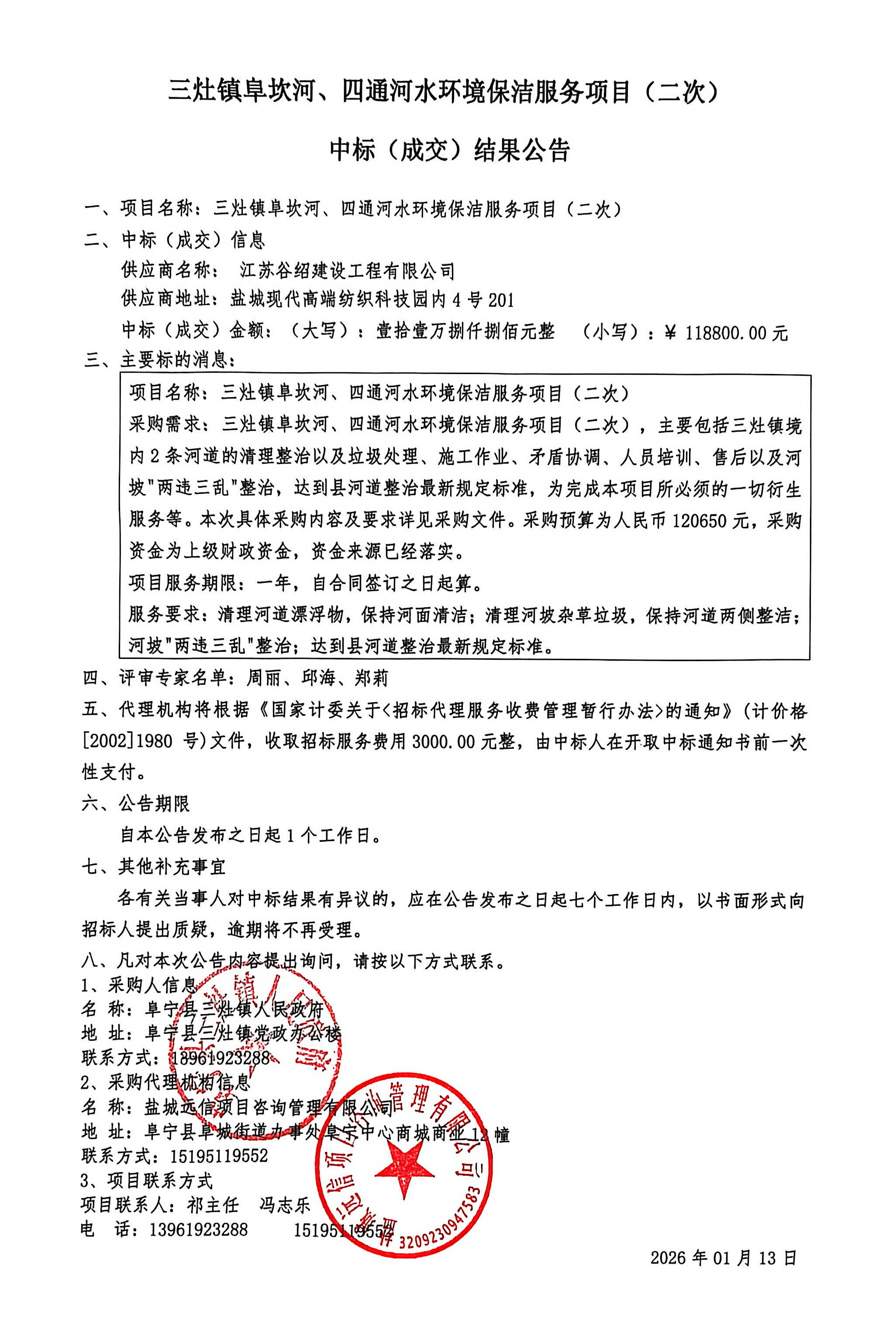 三灶镇阜坎河、四通河水环境保洁服务项目(二次) 中标结果公告