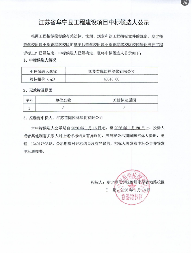 阜宁师范学校附属小学香港路校区校园绿化养护工程中标候选人公示