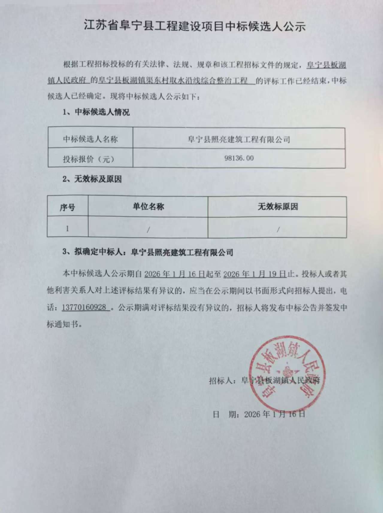 阜宁县板湖镇渠东村取水沿线综合整治工程中标候选人公示