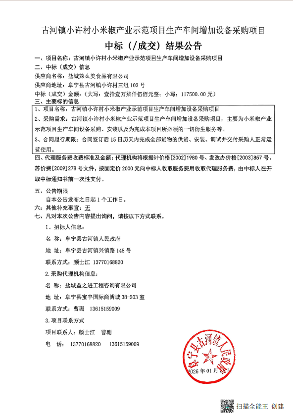 古河镇小许村小米椒产业示范项目生产车间增加设备采购项目