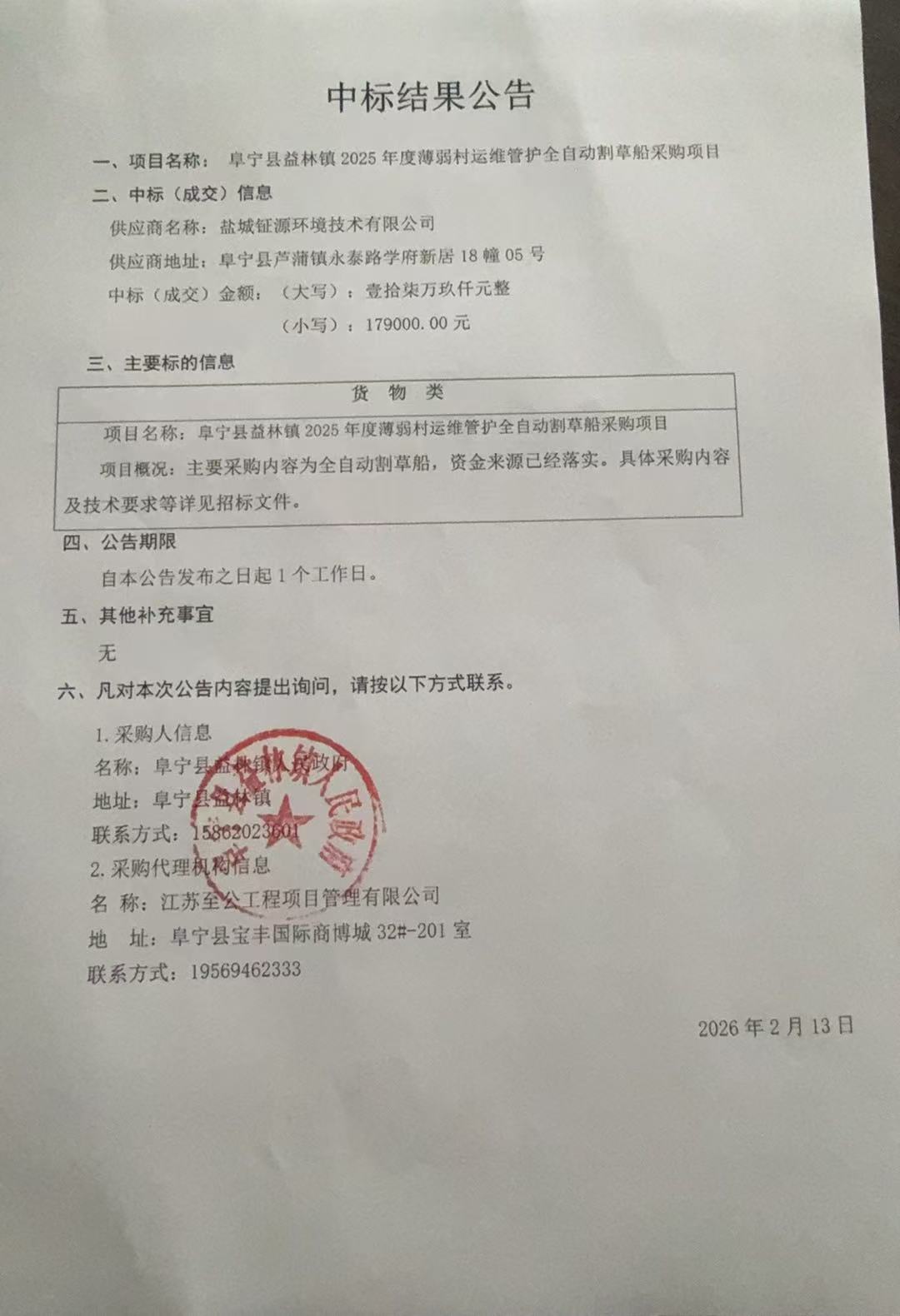 阜宁县益林镇2025年度薄弱村运维管护全自动割草船采购项目