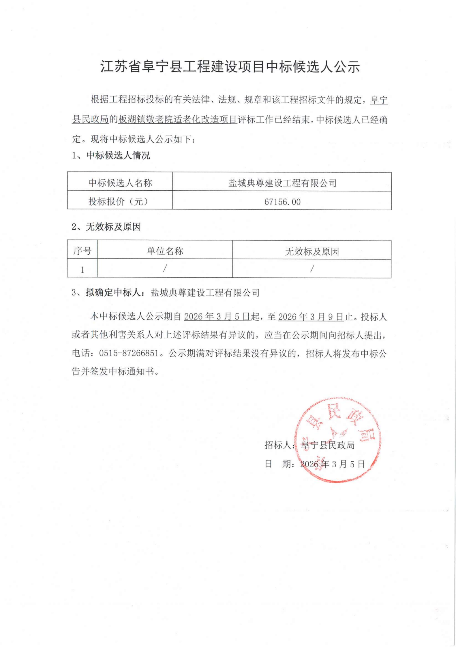 板湖镇敬老院适老化改造项目中标候选人公示