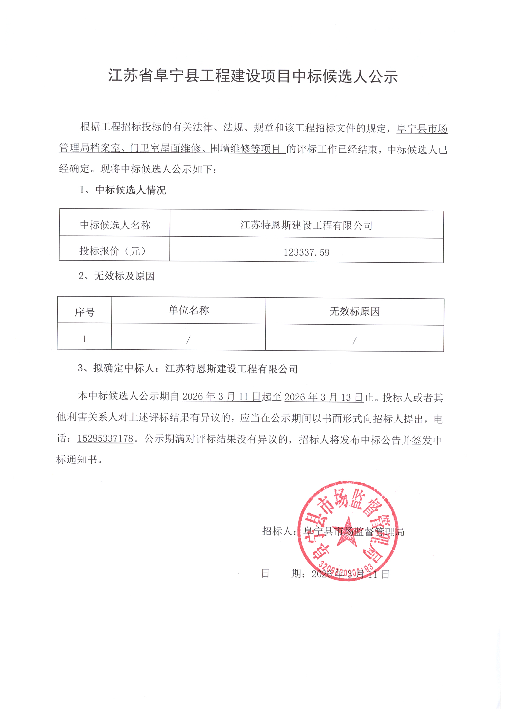阜宁县市场管理局档案室、门卫室屋面维修、围墙维修等项目中标候选人公示