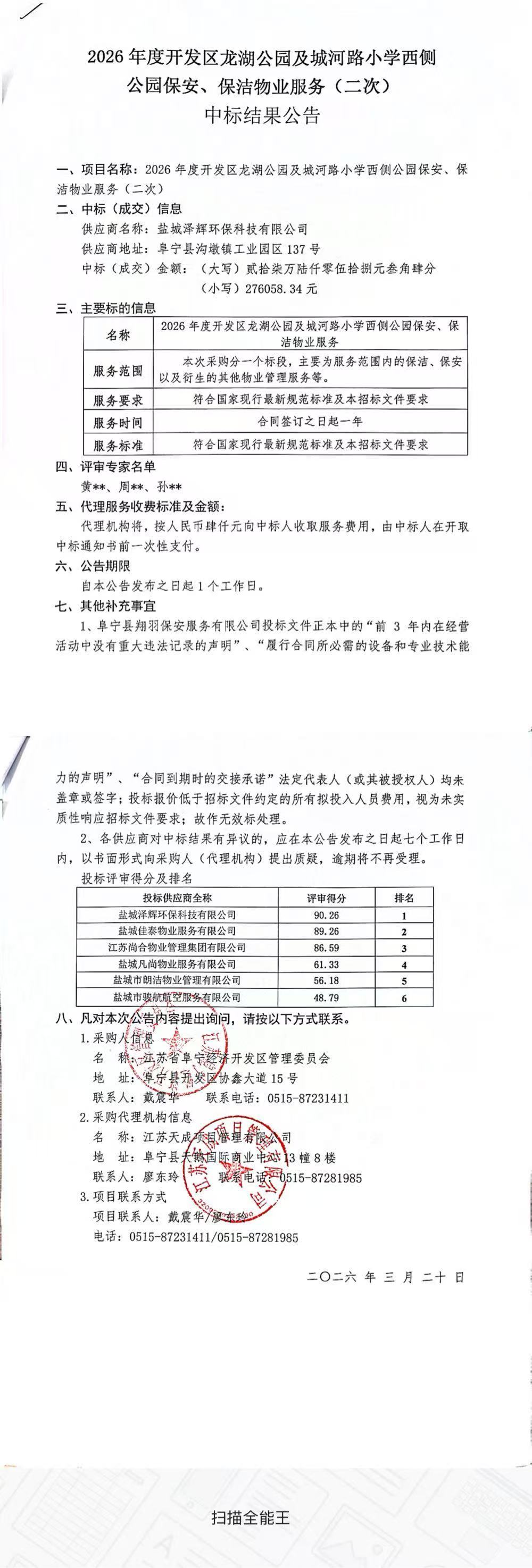 2026年度开发区龙湖公园及城河路小学西侧公园保安、保洁物业服务(二次)中标结果公告
