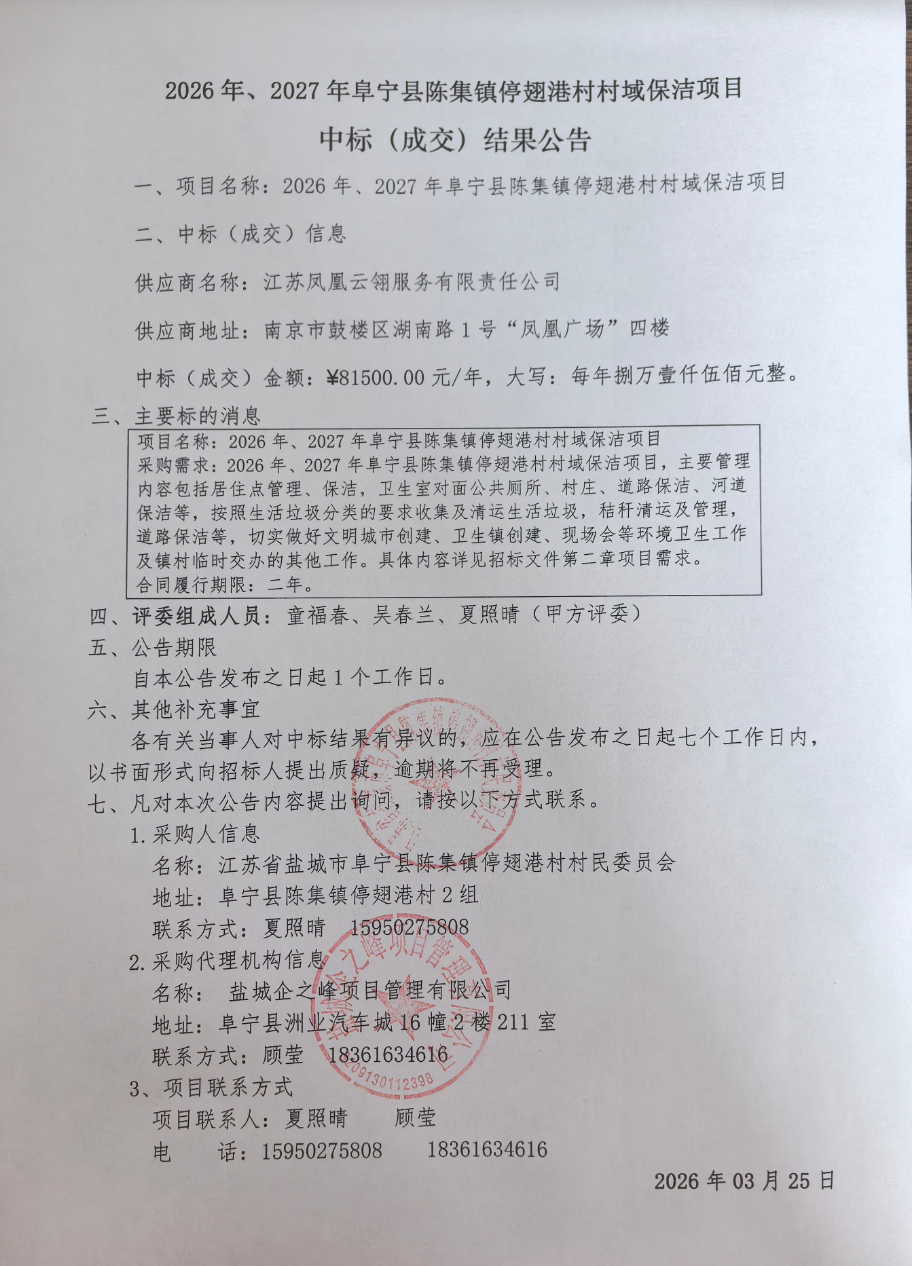 2026年、2027年阜宁县陈集镇停翅港村村域保洁项目
