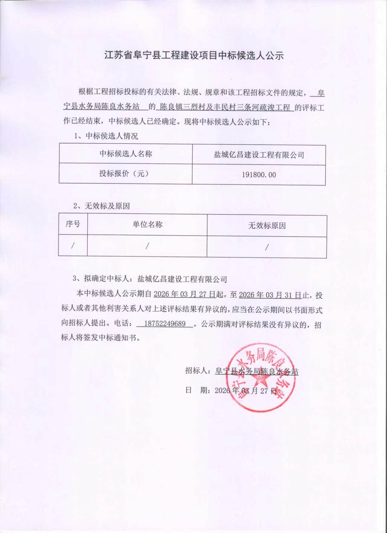陈良镇三烈村及丰民村三条河疏浚工程中标候选人公示