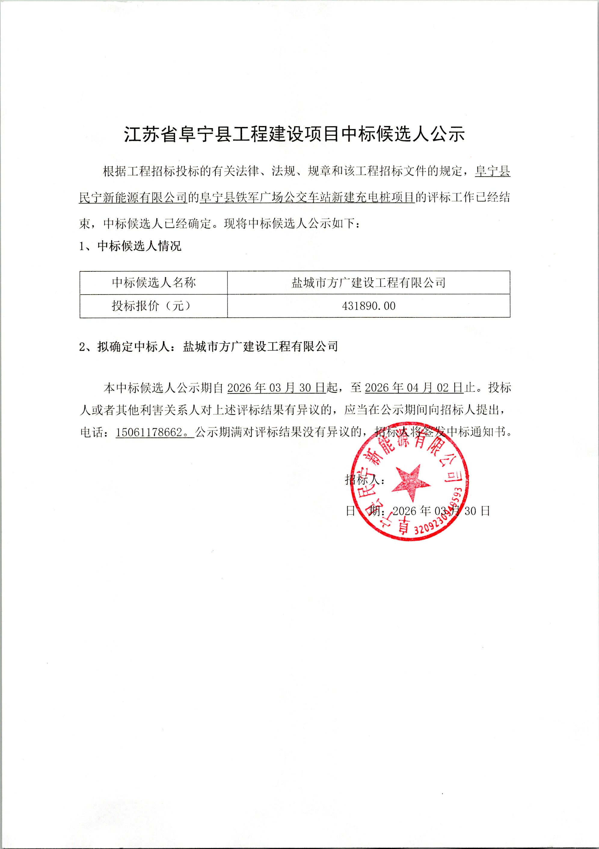 阜宁县铁军广场公交车站新建充电桩项目中标候选人公示