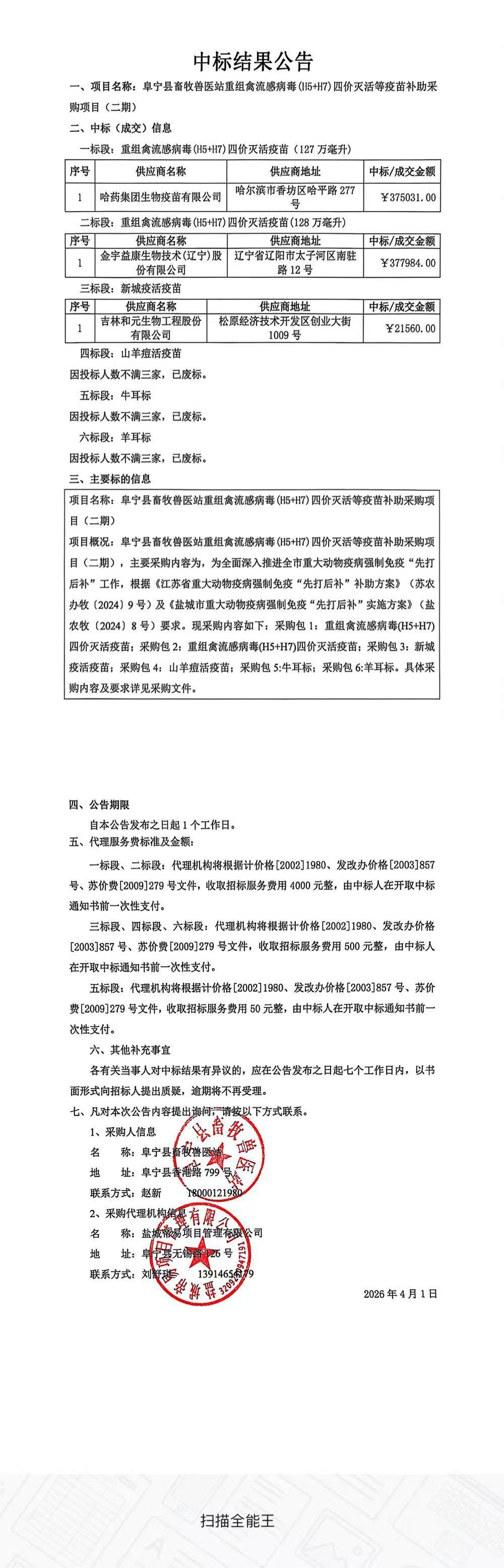 阜宁县畜牧兽医站重组禽流感病毒(H5+H7)四价灭活等疫苗补助采购项目(二期)中标公告