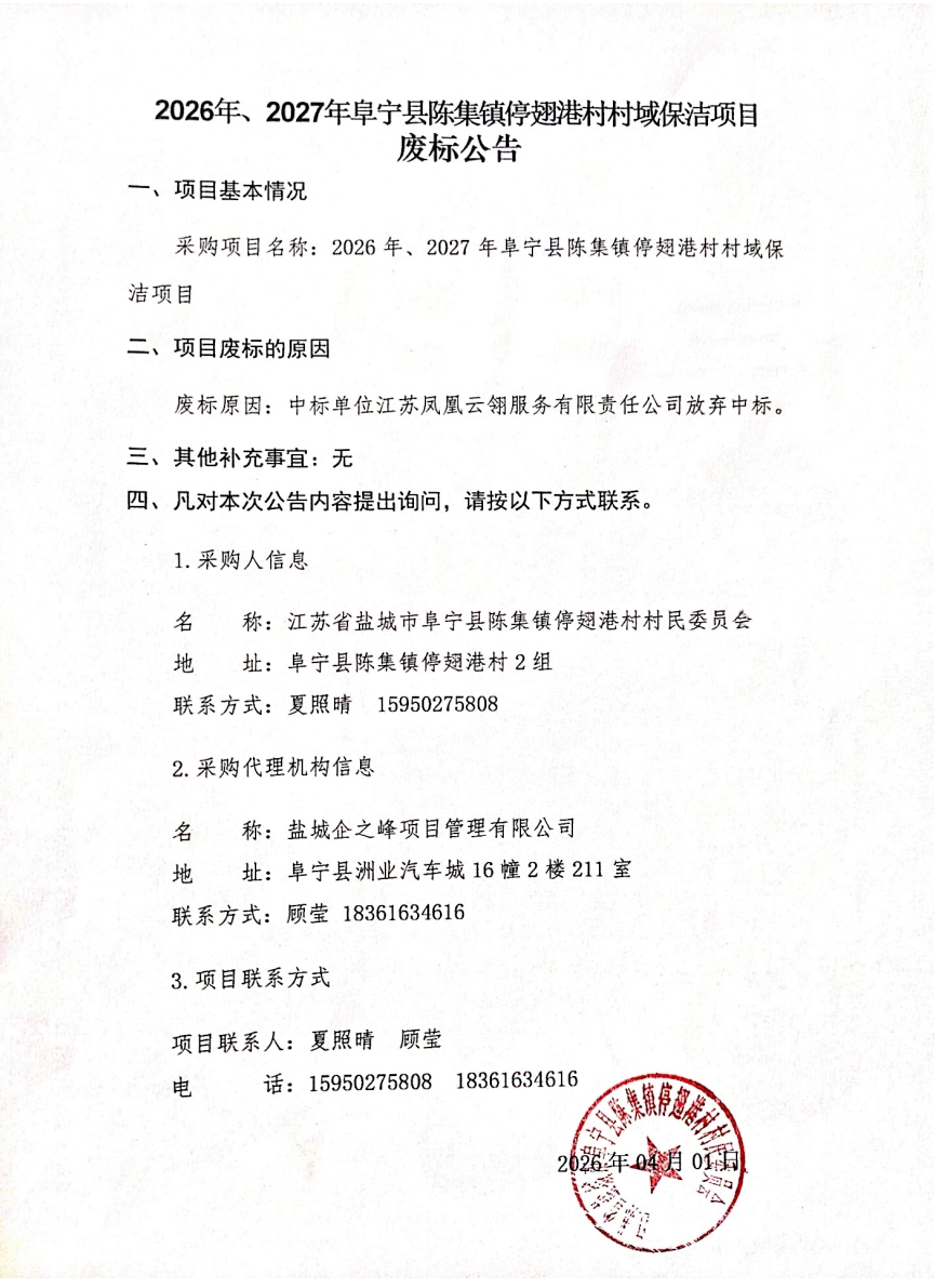 2026年、2027年阜宁县陈集镇停翅港村村域保洁项目废标公告