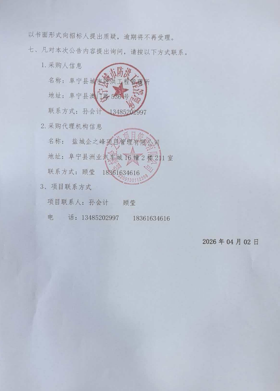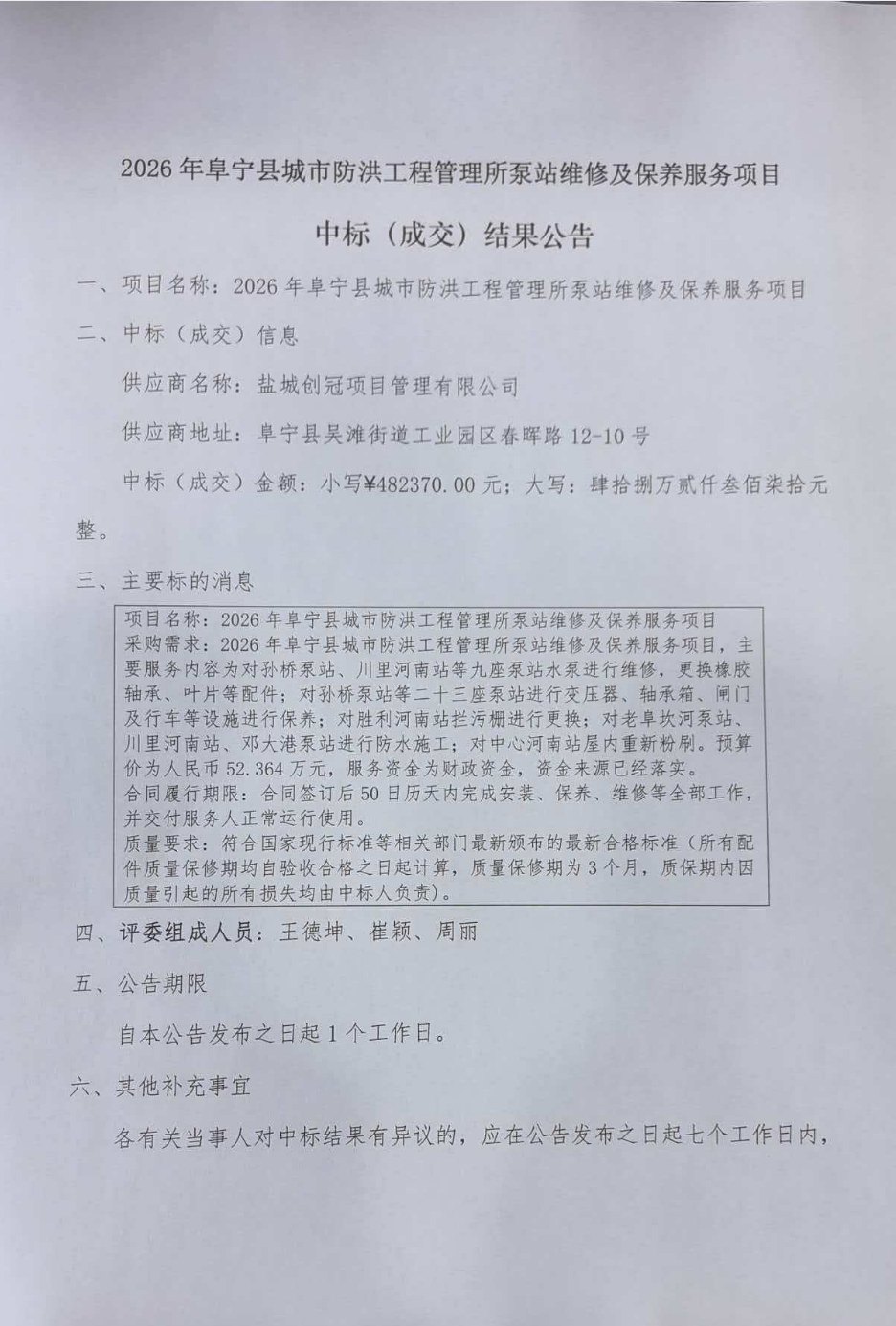 2026年阜宁县城市防洪工程管理所泵站维修及保养服务项目中标(成交)结果公告