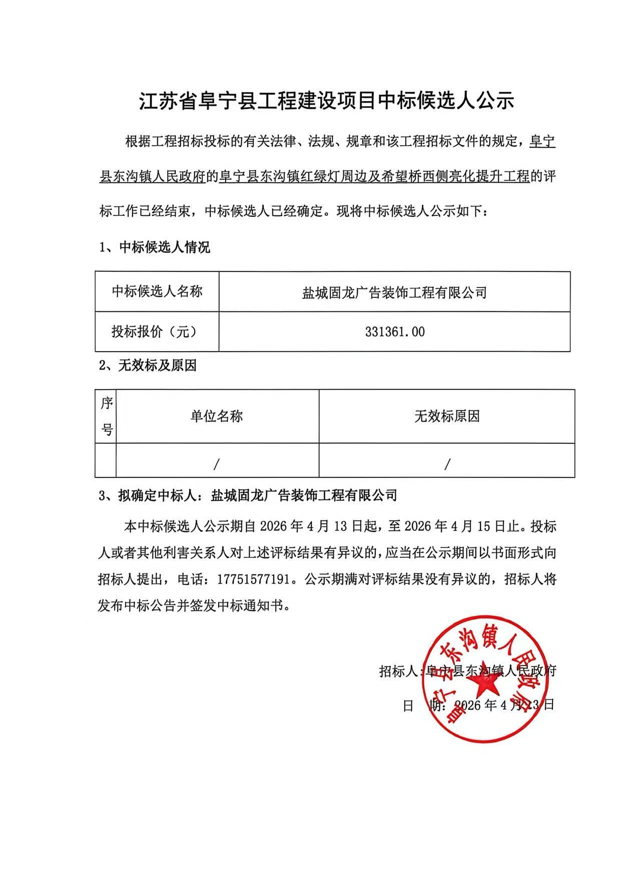 阜宁县东沟镇红绿灯周边及希望桥西侧亮化提升工程 中标公告