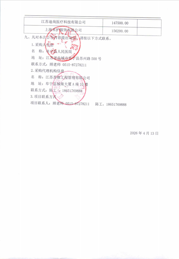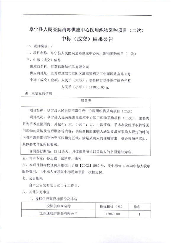 阜宁县人民医院消毒供应中心医用织物采购项目(二次)中标公告