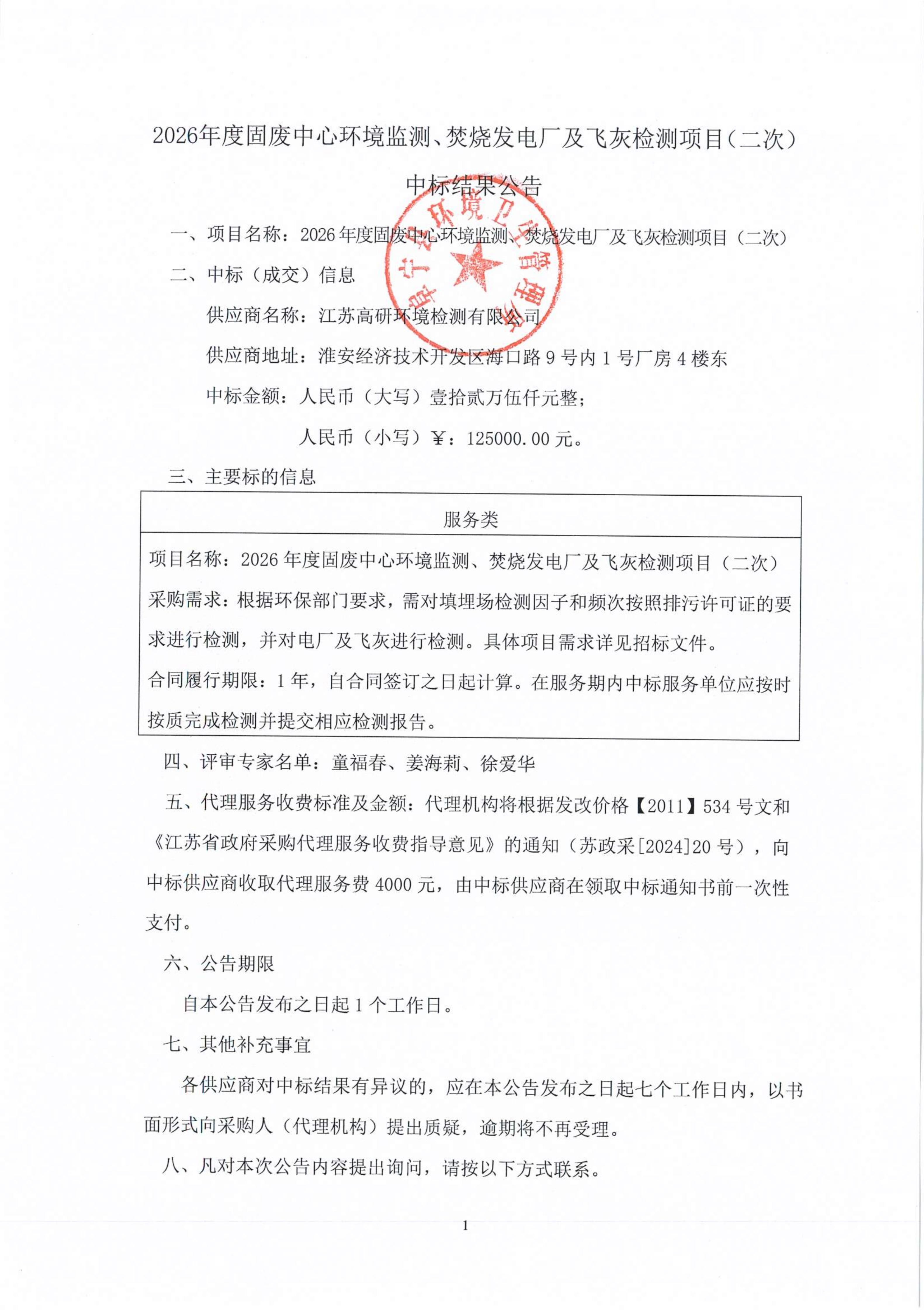 2026年度固废中心环境监测、焚烧发电厂及飞灰检测项目(二次)中标结果公告