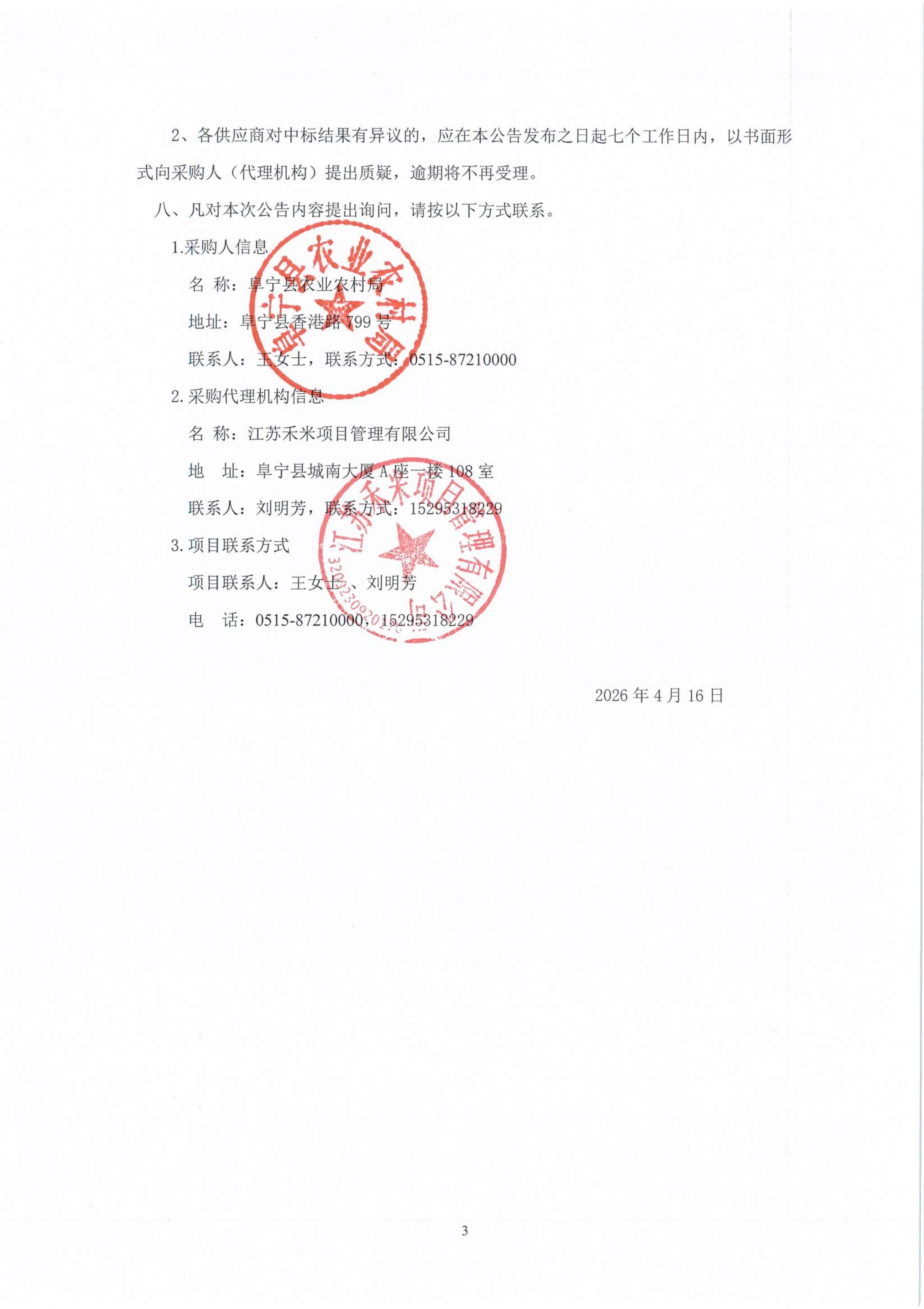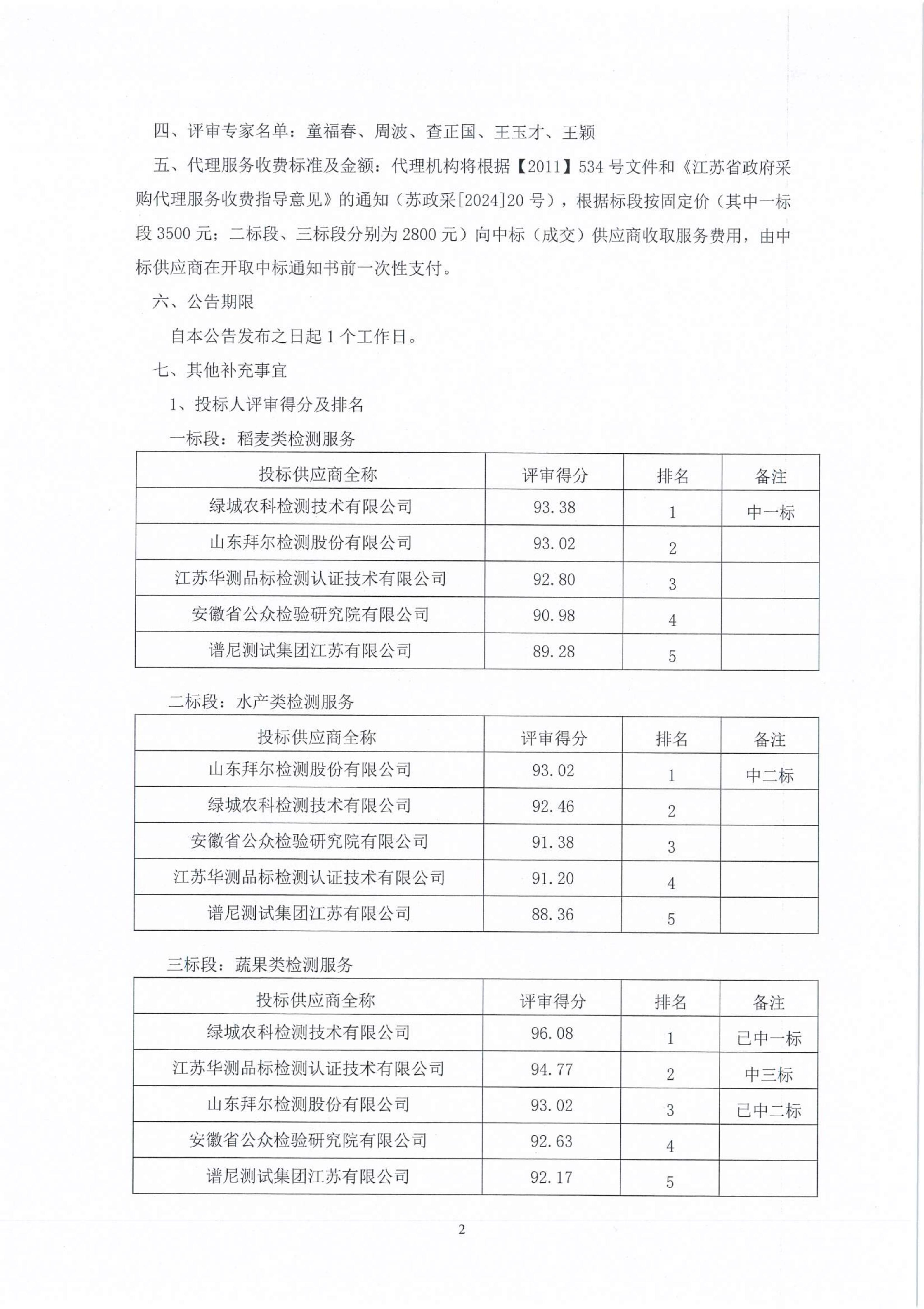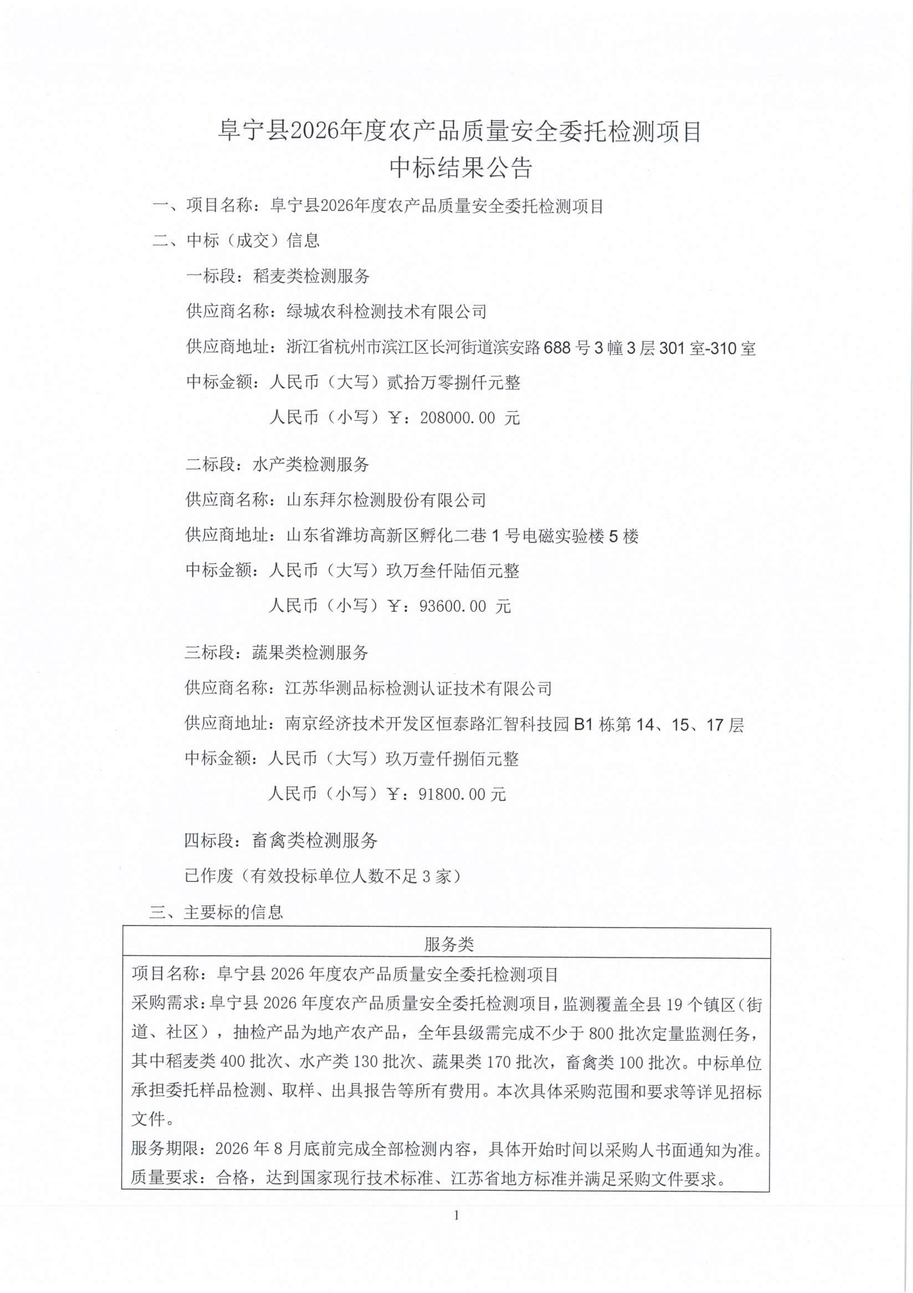 阜宁县2026年度农产品质量安全委托检测项目中标结果公告