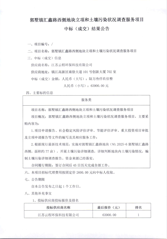 郭墅镇汇鑫路西侧地块立项和土壤污染状况调查服务项目成交结果公告