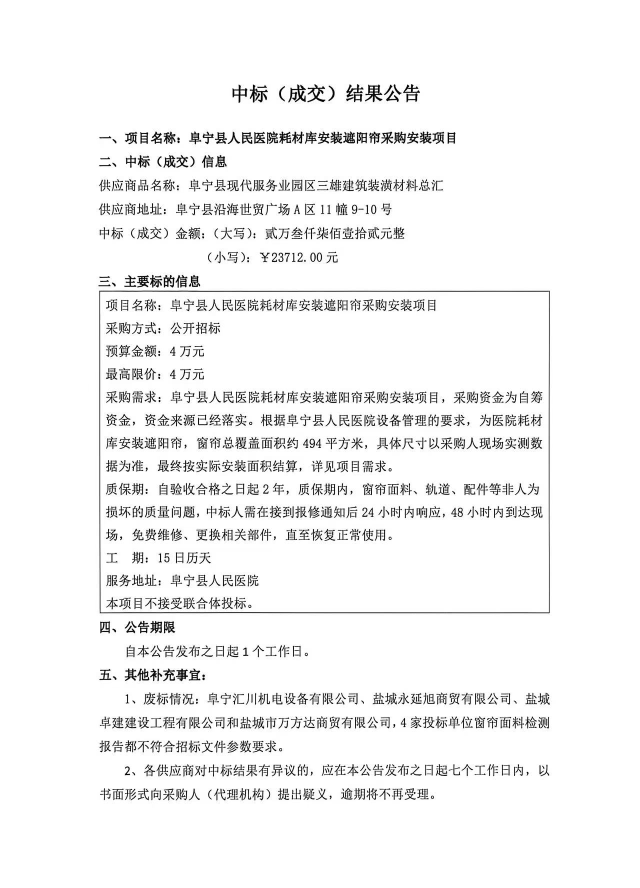 阜宁县人民医院耗材库安装遮阳帘采购安装项目 中标(成交)结果公告