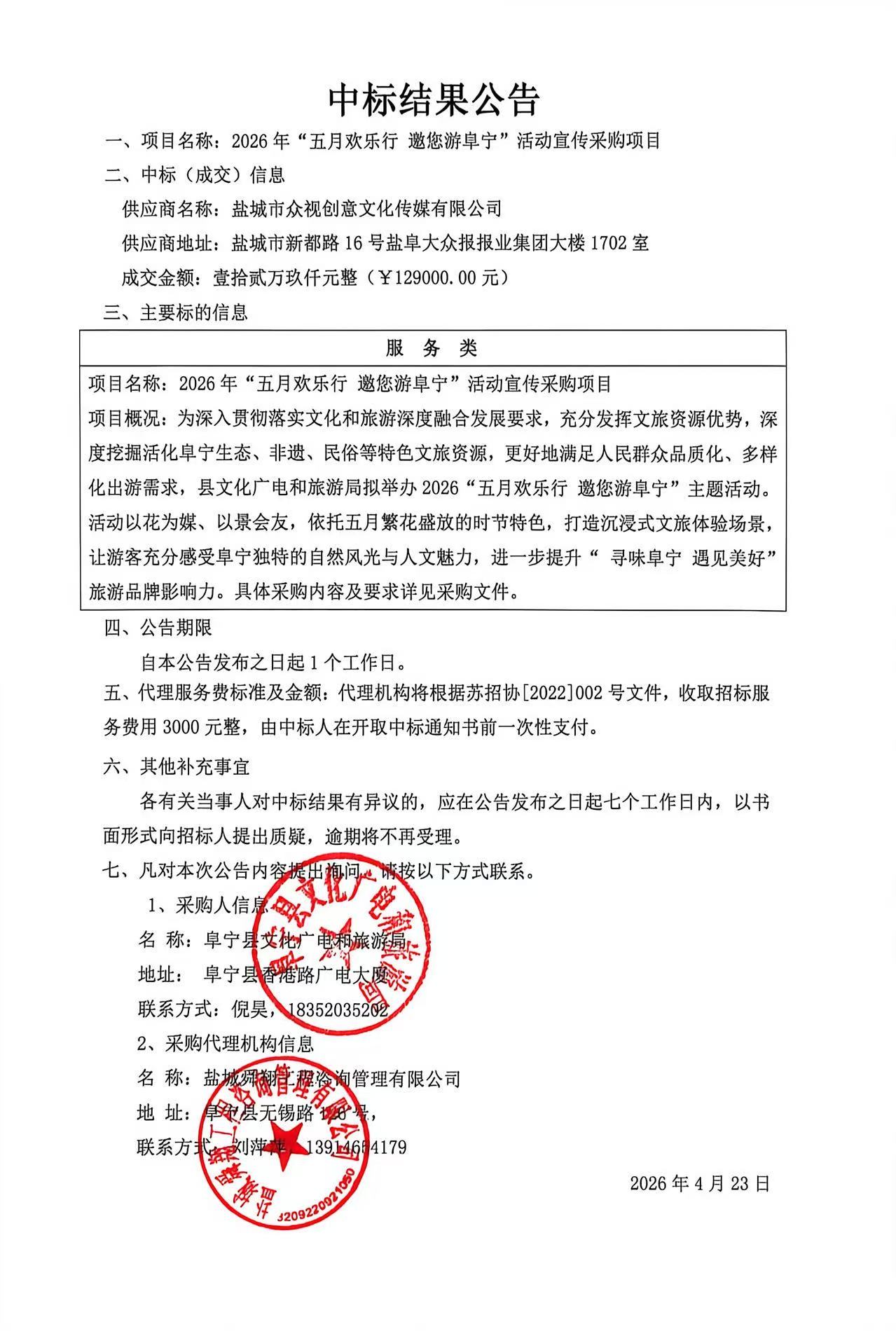 2026年“五月欢乐行 邀您游阜宁”活动宣传采购项目中标公告