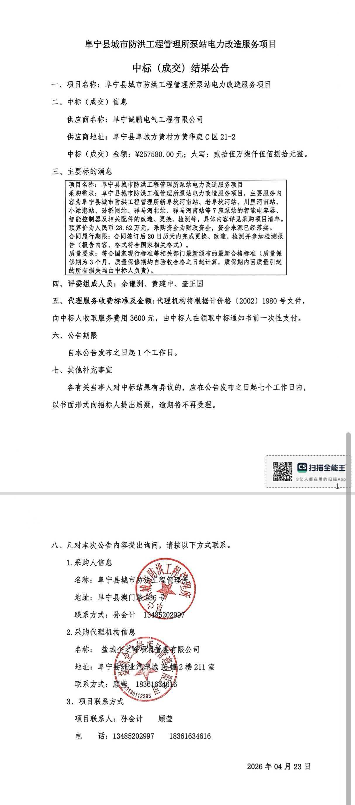 阜宁县城市防洪工程管理所泵站电力改造服务项目